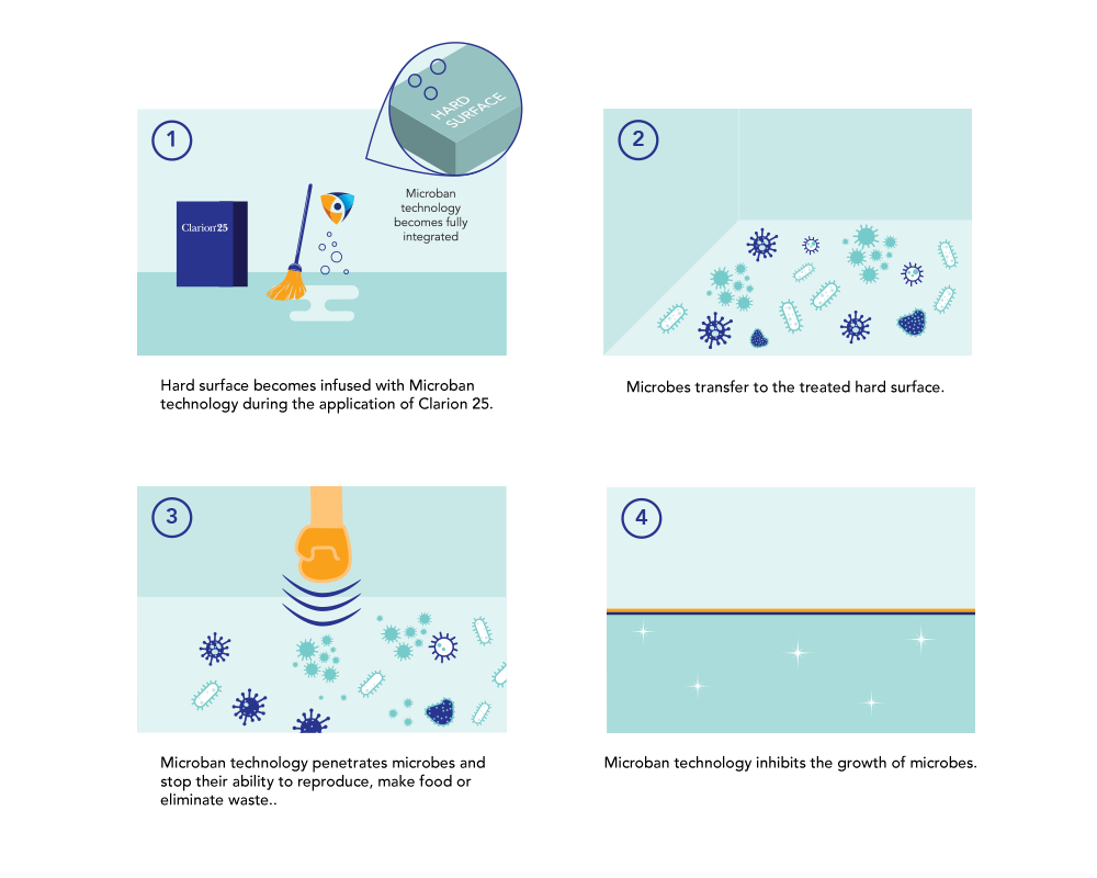 Whether you work in a hospital, school, or retail facility, finding ways to fight bacteria growth can improve the patient, student, and guest experience in any facility. Clarion® 25 Microban® Antimicrobial Floor Finish offers 24/7 product protection to proactively and continuously fight microbes at no additional cost, with no additional labor or procedures.